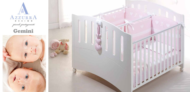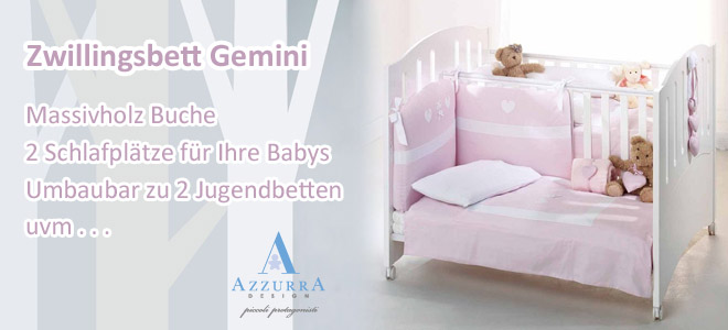 Das Kinderbett Gemini für Zwillinge ist das Herzstück der italienischen Babymöbel Kollektionen von Azzurra Design. Schon oft verkauft und immer wieder interessant für Zwillingsmütter ist es bereits jetzt zu unserem Bestseller geworden. Beim Anblick des Zwillingsbettes wird man zuerst durch seine harmonisch ansprechende Optik verzaubert. Weißes Buchenholz mit geschwungenen Linien und an Kopf- und Fußende durchbrochen erhält dieses Kinderbett eine gewisse Leichtigkeit, die sich auch in den eigenen vier Wänden zeigt.