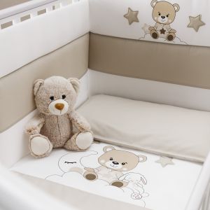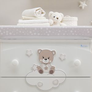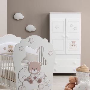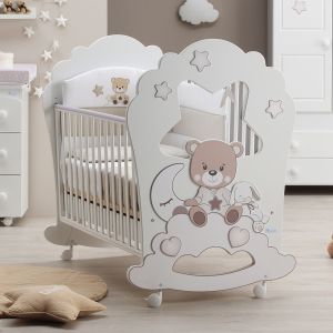 Zuckersüß ist unsere neue Kollektion "Bonne Nuit" mit dem müden Teddybär der zusammen mit seinem Kuschelhasen auf einer Wolke sitzt. Das sonst relativ schlichte Bett ist ganz in weiß gehalten und aus Buchenholz gefertigt. Ein seitliches Sprossengitter ist höhenverstellbar, sodaß Sie ihr Baby leicht ins Bettchen legen können. Unter der Liegefläche befindet sich ein ausziehbarer Bettkasten, welcher zusätzlichen Stauraum im Babyzimmer bietet.