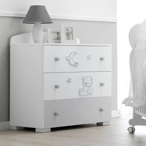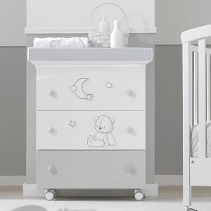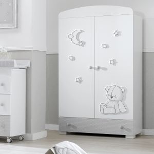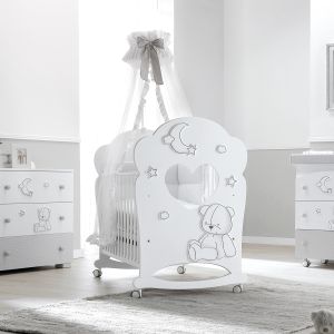 Das italienische Babybett Stella ist schlicht verfügt am Fußende über ein niedliches und kindgerechtes Holz-Dekor. Ein niedlicher müder Teddybär sitzt unter Mond und Sternen und lässt sich toll greifen, sobald das Baby seine ersten Stehversuche macht.