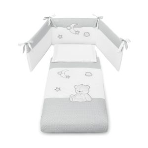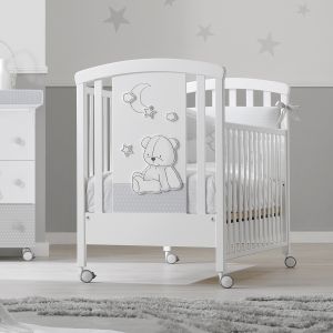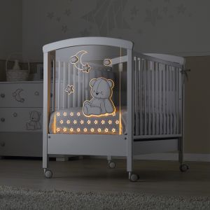 Dieses wunderschöne Babybett hat eine besondere Form und besitzt ein kleines mit Plexiglas verkleidetes herzförmiges Fenster am Fußende, durch das das Kind schauen kann. Zudem besticht das Babybettchen durch das niedliche Teddybären-Motiv mit Mond und Sternen. Dieses Babybett besitzt ein höhenverstellbares Lattenrost, einen kleinen, ausziehbaren Bettkasten für Bettzeug und Spielwaren und ist auf vier Rädern gelagert, also fahr- und drehbar im Raum.