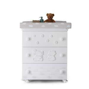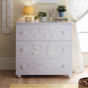 Das hübsche Hochregal aus der Linie "Didi" ist ein optimales Schränkchen um Kleinigkeiten aufzubewahren. Ob Wickelutensilien oder Spielzeug, in dem mit sechs Schubladen ausgestatteten Regal findet sich viel Platz. Das Highlight bildet das niedliche Motiv aus Hase und Teddybär, welches an den obersten beiden Fronten der Schubladen hängt.