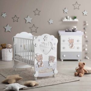 Mit diesem Kleiderschrank für Kinder schaffen Sie Ordnung im Kinderzimmer. Babys Bekleidung findet sowohl hinter den beiden Flügeltüren Platz, aber auch in den beiden großen Schubfächern. Der Kleiderschrank NOA aus der Reihe Love Me passt zu den gleichnamigen Azzurra Babymöbeln.