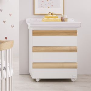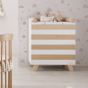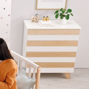 Mit dem Kleiderschrank Ora schaffen Sie mühelos Ordnung im Kinderzimmer. Dieser praktische Schrank bietet ausreichend Platz für die gesamte Babykleidung, die sowohl hinter den beiden stilvollen Flügeltüren als auch in den zwei großzügigen Schubfächern verstaut werden kann.