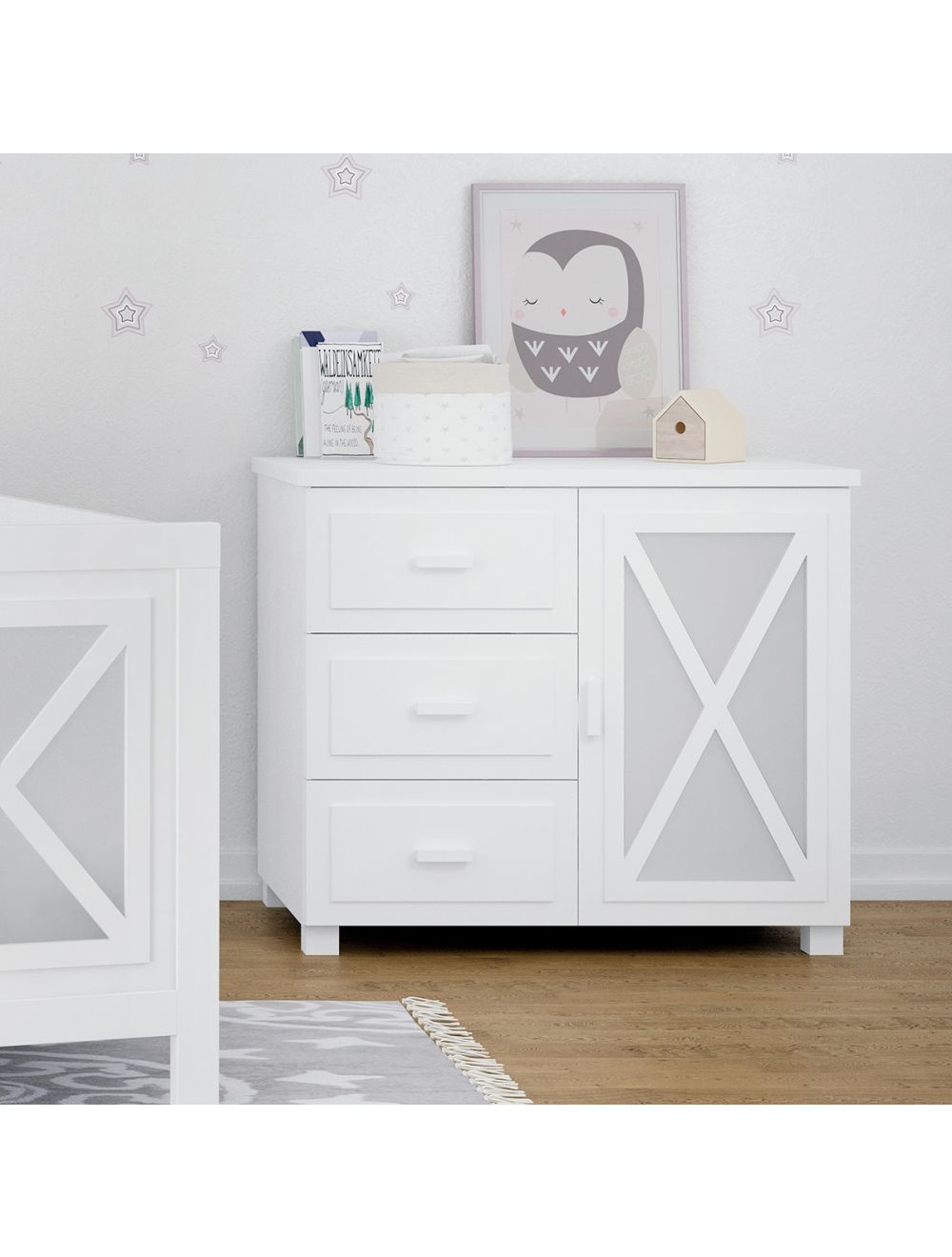 Dieses besondere Möbelstück kann sowohl als Kommode als auch als Wickelkommode (mit passendem Aufsatz)genutzt werden. Erhältlich ist diese Kommode in rein weiß oder mit Milchglas-Tür (bitte auswählen). Drei Schieber mit Soft-close-Mechanismus und ein Fach mit Tür bieten maximalen Stauraum für Babysachen und Wickelutensilien.