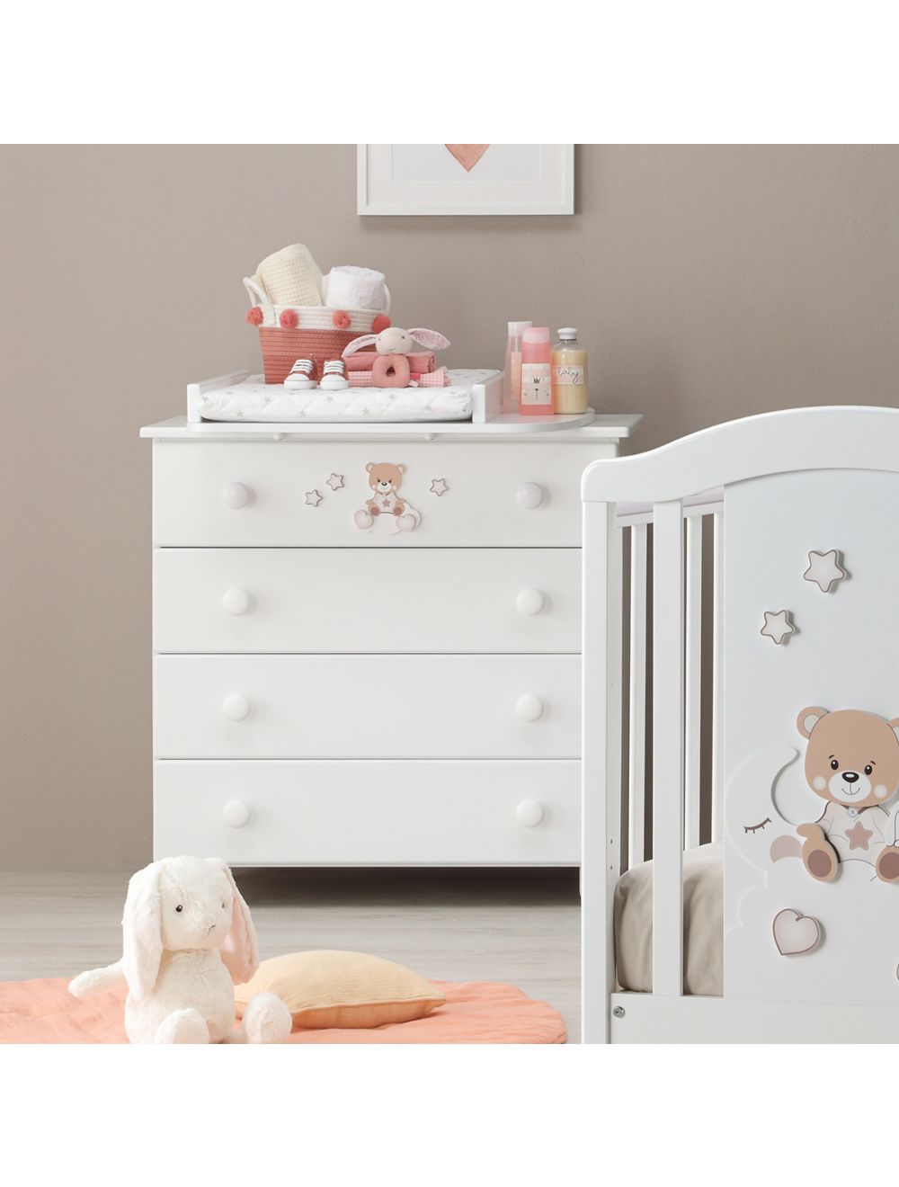 Diese schlichte Kinder-Kommode NOA in der Farbe weiß aus Buchenholz verfügt über vier geräumige Schubfächer, die reichlich Stauraum bieten. Die Kommode lässt sich hervorragend zu mehreren Kollektionen kombinieren, denn Sie können Sie wahlweise mit Dekor bestellen. Sie kann darüber hinaus auch im Wohnzimmer oder Jugendzimmer platziert werden. In Kombination mit einer Wickelauflage kann diese Kommode als Wickelkommode genutzt werden.