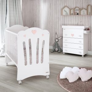 Diese wunderschöne Bade-Wickelkommode Corazones kann einzeln oder in Kombination zum gleichnamigen Babybett/ Beistellbett Corazones bestellt werden. Die Kommode verfügt über 4 geräumige Schieber mit je zwei runden Griffen. Im Lieferumfang enthalten ist eine Babybadewanne, die sich unter der Wickelauflage verbirgt und herausgenommen werden kann. Die Wickelauflage aus PVC hat zwei erhöhte Seiten. Ebenfalls enthalten ist eine Seifenablage. Die Wickelkommode ist auf vier Rädern, zwei davon bremsbar, gelagert und kann folglich im Raum bewegt werden. Die Höhe von 89cm lässt ein rückenschonendes Wickeln und Baden zu. Wird die Bade-Wickelkommode zum Wickeln nicht mehr benötigt, können Badewanne und Wickelauflage abgenommen werden und eine schöne Kommode ziert das Kinderzimmer. Erhältlich in 5 Farbvarianten.